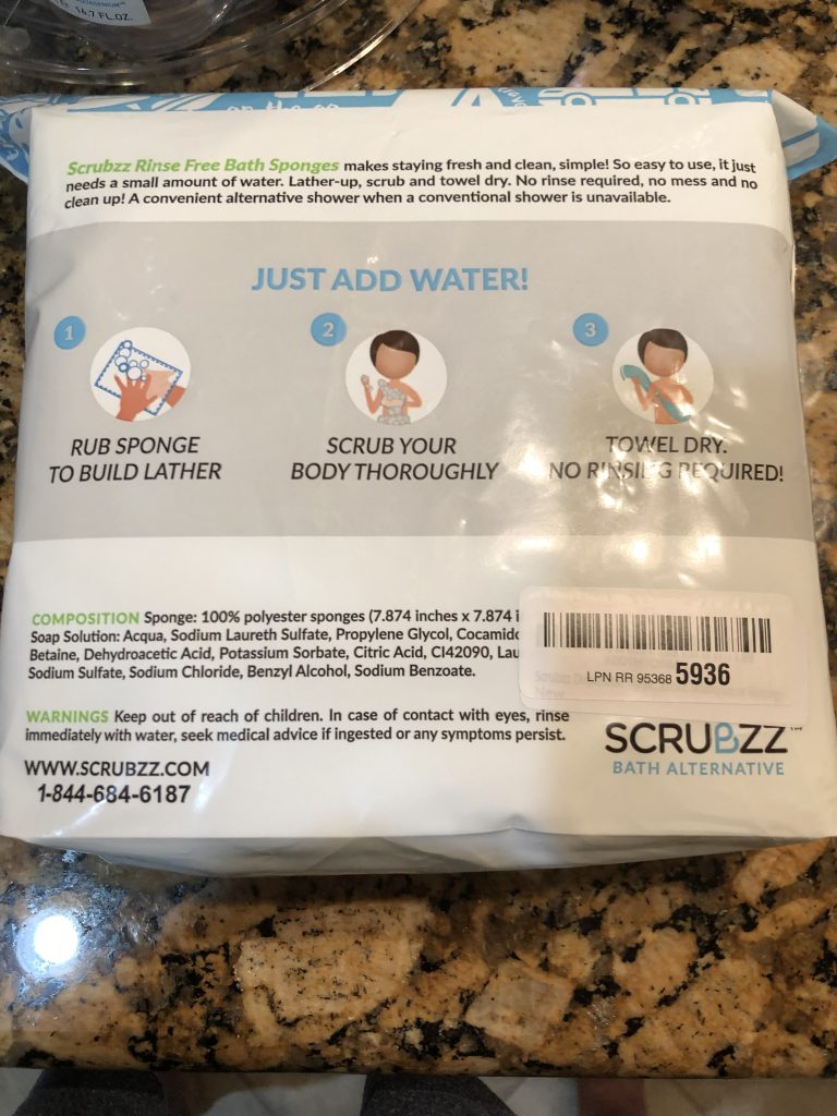 After going through many bathing wipes that end up being the same, I wanted to try the Scrubzz Sponges. Early reviews were fairly positive and having a foaming bath piqued my interest. Also, the sponge has the same properties as most foaming soap and will be a better clean than a simple bathing wipe.